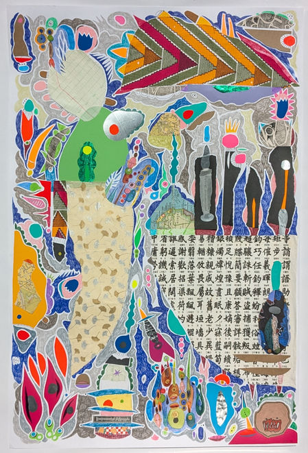 “Mapscapes” is an exhibition of collages created from artifacts collected during Candacee White's travels to over 80 countries. Each piece incorporates a variety of materials, including Hindi, Arabic and Burmese newspapers, gold leaf from a Belgian junk market, old maps, color swatches from local garage sales, origami paper from Japan and Hanji paper from Korea. Ink and pencil are used to fill in the empty space, allowing imagination to fill in the gaps in memory.