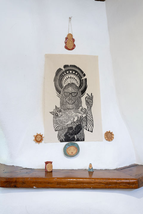 In my linocut self-portrait, I reflect on my own journey of exploring Mexico, developing my art, and shifting my perspective. I wear glasses in an effort to see more clearly and hold Churro, our cross-eyed resident cat, with empathy for those (myself included) who do not always see the world with perfect clarity. I wear a broken halo to acknowledge my imperfections.