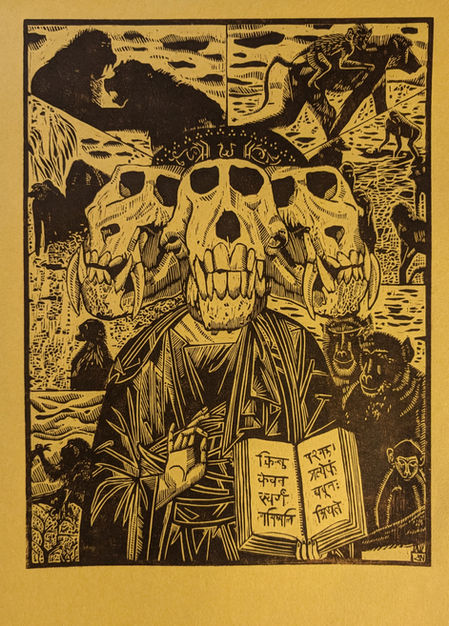 My woodcuts combine traditional religious and historical imagery from disparate sources, often with animals.